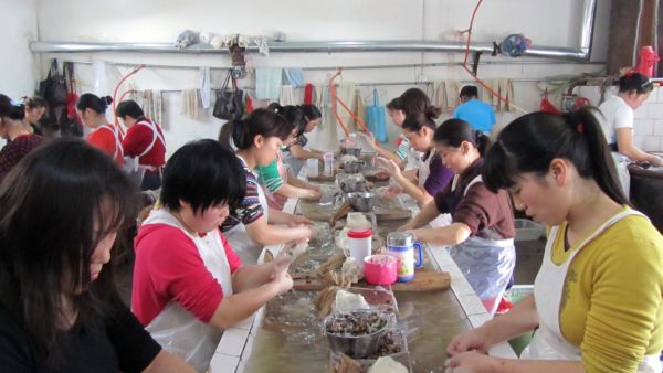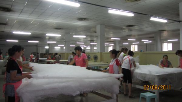 走進(jìn)華詩雅蒂拳頭產(chǎn)品“蠶絲被”生產(chǎn)的源頭工序煮繭—?jiǎng)兝O生產(chǎn)車間,不由得感慨萬端。這里的剝繭員工沒有一個(gè)抬頭看我的,只顧著埋頭手中的活。本來好看的雙手被浸泡得有些慘不忍睹,只覺一抹濕潤的暖意滑過我有些潮濕了的眼眸。為了節(jié)省時(shí)間,她們中午都是自帶干糧飯菜,因?yàn)槎鄤诳梢远嗟。徐曉華,最資深的老剝繭工了,也是每個(gè)月工資拿得最高的,月工資都在二千五以上。全神貫注的神情,一絲不茍的動(dòng)作,你的眼睛不由自主的就被俘獲,牢牢粘住的不愿挪開。在她的世界里只有繭,再也騰不出空隙去裝下外面季節(jié)的變換與喧囂。這需要怎樣一種厚重的敬業(yè)才能支撐起這磅礴的專一與嫻熟啊!