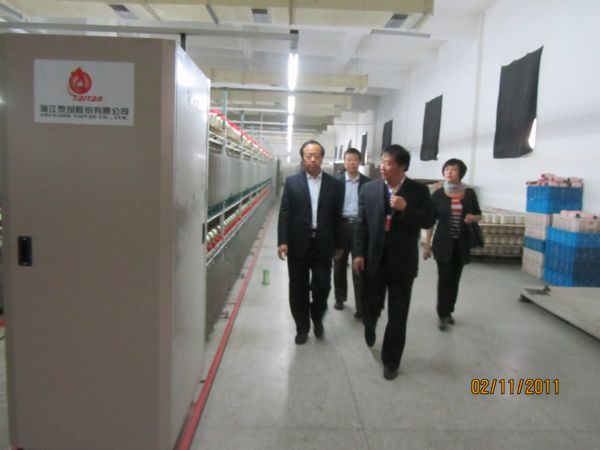 11月2日上午,當(dāng)賀主任一行風(fēng)塵仆仆來到公司,從阜洽會現(xiàn)場匆匆忙忙趕來的董事長馬品德熱情接待并陪同深入生產(chǎn)車間一線。在實地參觀考察中,賀主任一行興致勃勃聽取著董事長對繅絲與織綢生產(chǎn)的流程與工藝介紹,每到一處都仔細(xì)察看、詢問工藝生產(chǎn)情況,并不時報以滿意的點頭與微笑。在劍桿二車間里,當(dāng)看到精美的綢緞從嶄新的電子提花織機里璨然而出時,非常高興,不時躬身俯首詳情察看,頻頻致意。馬董事長在隆隆的織機聲中不時加以手勢介紹:這是公司力舉引進(jìn)世界先進(jìn)的無梭織機及相關(guān)設(shè)備,采用高新技術(shù)及工藝,生產(chǎn)獨具中國特色的高檔新型真絲面料。當(dāng)考察一行來到鍋爐車間生產(chǎn)重地時,對公司果斷實施綠色環(huán)保的節(jié)能舉措贊賞有加。