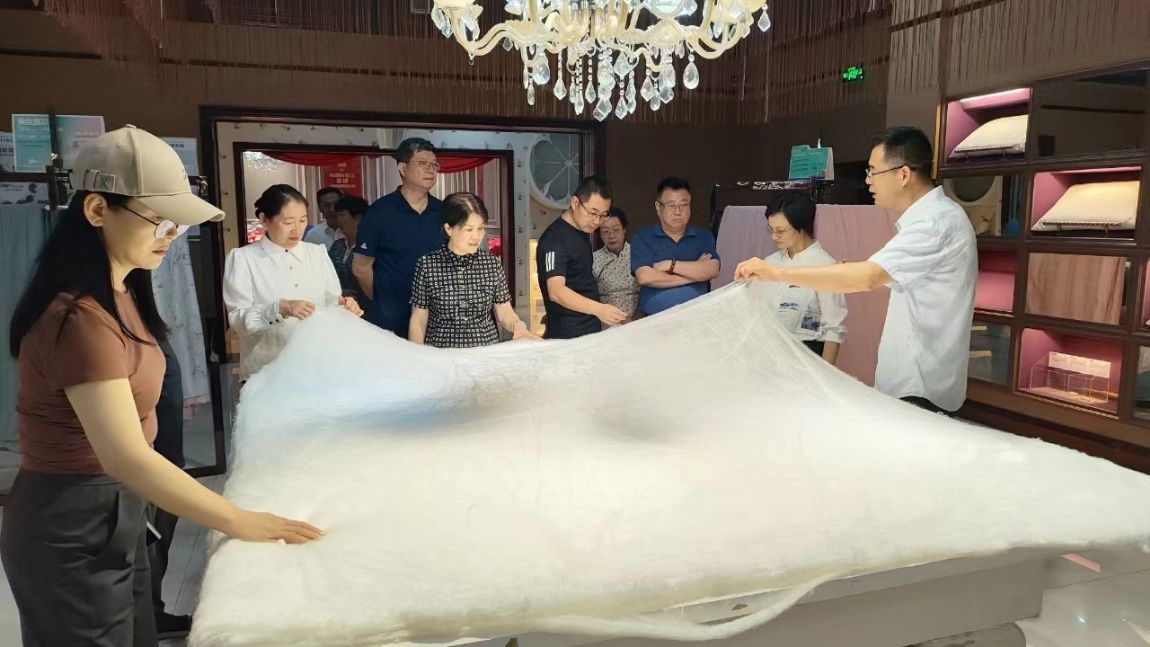 考察團(tuán)一行人員首先來到館內(nèi)的絲綢文化廳,在仔細(xì)聆聽了工作人員的《字說絲綢》介紹后,對(duì)歷史悠久、博大精深的中國絲綢文化深感贊嘆。在華詩雅蒂真絲產(chǎn)品展示廳,考察團(tuán)人員對(duì)琳瑯滿目、色彩斑斕的真絲產(chǎn)品愛不釋手,尤其是看到各個(gè)款式的絲綢文化禮品,更是駐足觀賞良久。當(dāng)了解到京九絲綢是《蠶絲被》國家標(biāo)準(zhǔn)主要起草單位之一時(shí),大家對(duì)華詩雅蒂真絲產(chǎn)品的精湛工藝和公司的科技實(shí)力給予了高度的肯定。