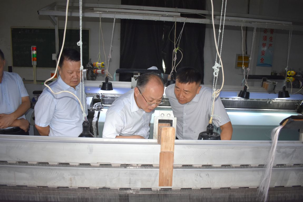 陳處長一行在公司黨委書記、董事長馬品德的陪同下,首先來到了劍桿車間。這里,現(xiàn)代化的生產(chǎn)設備高速運轉(zhuǎn),工人們正緊張有序地操作著機器,一寸寸高品質(zhì)的綢緞在機械聲中緩緩而出。陳處長詳細詢問了車間生產(chǎn)流程、技術(shù)創(chuàng)新及黨員在生產(chǎn)一線發(fā)揮的先鋒模范作用,對京九絲綢在提升生產(chǎn)效率、保障產(chǎn)品質(zhì)量方面取得的成就給予高度評價。隨后,調(diào)研組一行來到繅絲車間,近距離感受制絲工藝。繅絲車間內(nèi),傳統(tǒng)技藝與現(xiàn)代自動化生產(chǎn)線結(jié)合,展現(xiàn)了京九絲綢在傳承與創(chuàng)新上的不懈追求。