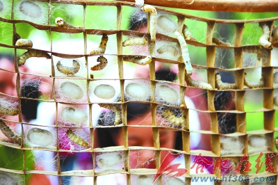上周六,晨報(bào)的10位“養(yǎng)蠶能手”在家長(zhǎng)的陪同下,走進(jìn)了阜陽(yáng)蠶桑養(yǎng)殖基地,果真是不看不知道,一看嚇一跳。這里的蠶寶寶不但大出許多,還可以吐絲成繭,織就潔白如玉的蠶絲被呢。