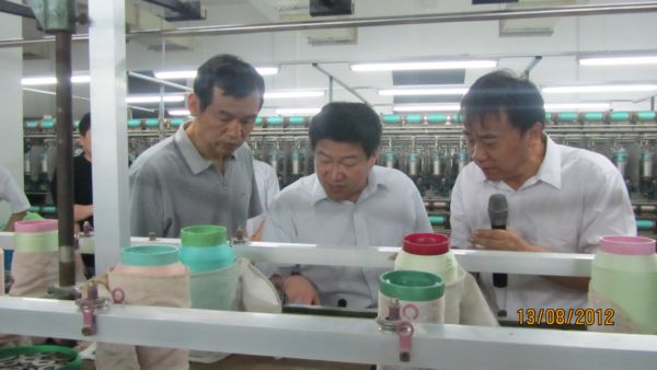 湯春和書記一行驅(qū)車來到公司劍桿一車間路口,在馬董事長的陪同下先后參觀了公司劍桿一車間、劍桿二車間、繅絲車間、復(fù)整車間等生產(chǎn)現(xiàn)場。在參觀過程中,董事長詳細(xì)介紹了各車間的生產(chǎn)工藝流程,在繅絲以及復(fù)整車間,馬董親自動(dòng)手演示。湯書記一行在聽取董事長的介紹后,對真絲的生產(chǎn)工藝流程產(chǎn)生了濃厚的興趣,每到一處都仔細(xì)察看,不時(shí)提出問題和董事長探討。尤其在劍桿車間,看到公司新引進(jìn)行業(yè)內(nèi)最先進(jìn)的意大利劍桿設(shè)備,湯書記一行贊不絕口。