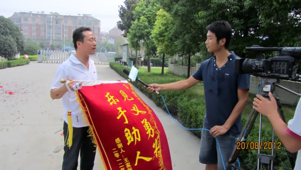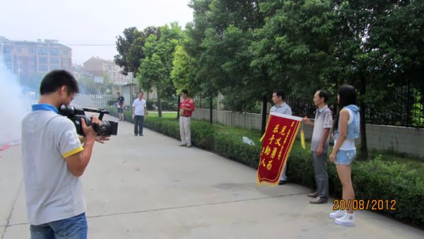 8月20日上午10時(shí),安徽京九絲綢公司辦公大樓門前響起一陣長久的鞭炮聲,市民王先生與其女激動的將一面繡著“樂于助人,見義勇為”的錦旗送到公司工會主席葛炯與復(fù)整車間員工原曉飛手中,感謝員工原曉飛見義勇為的同時(shí),感謝公司培養(yǎng)出了這么樂于助人的好員工。隨同王先生前來的還有市電視臺新聞采訪人員現(xiàn)場目睹并攝下了這一動人場面。