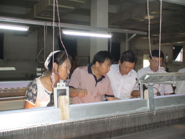 方向瑜局長(zhǎng)等一行人在馬總的陪同下,依次參觀了我公司新建的繅絲車間、劍桿車間等,在參觀考察過(guò)程中,馬總就我公司目前的發(fā)展經(jīng)營(yíng)情況向各位領(lǐng)導(dǎo)做了詳細(xì)的匯報(bào):我公司從上游的栽桑、養(yǎng)蠶、收烘,到中游的繅絲、織綢、服裝與家紡生產(chǎn),再到下游終端零售專賣,是一家產(chǎn)業(yè)鏈完整的綜合性繭絲綢企業(yè),公司總占地380多畝,在崗員工1600多名,擁有世界級(jí)先進(jìn)水平的飛宇2000優(yōu)選型自動(dòng)繅絲機(jī)20組,有梭織機(jī)160臺(tái),意大利劍桿織機(jī)48臺(tái)以及即將上馬的48臺(tái)意大利劍桿織機(jī)。目前,公司為了適應(yīng)瞬息萬(wàn)變的市場(chǎng)需求,斥巨資打造了終端品牌“華詩(shī)雅蒂”,力爭(zhēng)把 “華詩(shī)雅蒂”自主品牌打造成為中國(guó)的著名商標(biāo)。“華詩(shī)雅蒂”包涵了服飾、家紡、工藝品等真絲系列產(chǎn)品。