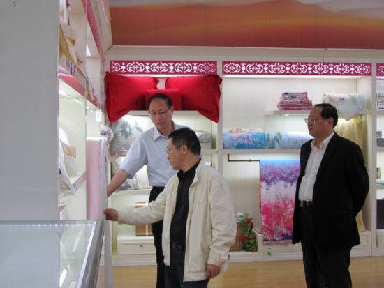 風(fēng)塵仆仆的徐主席一行在公司總經(jīng)理李開(kāi)典、副總經(jīng)理李慶文的陪同下深入生產(chǎn)車間,興致勃勃地查看了車間的生產(chǎn)情況。在“華詩(shī)雅蒂”產(chǎn)品展示廳內(nèi),李總詳細(xì)地向隨行的領(lǐng)導(dǎo)介紹那一款款精美、華麗的絲綢產(chǎn)品。