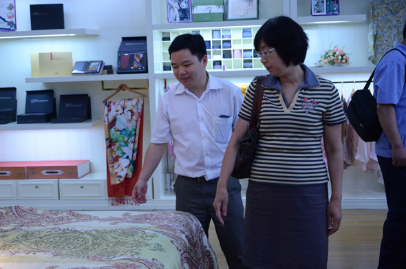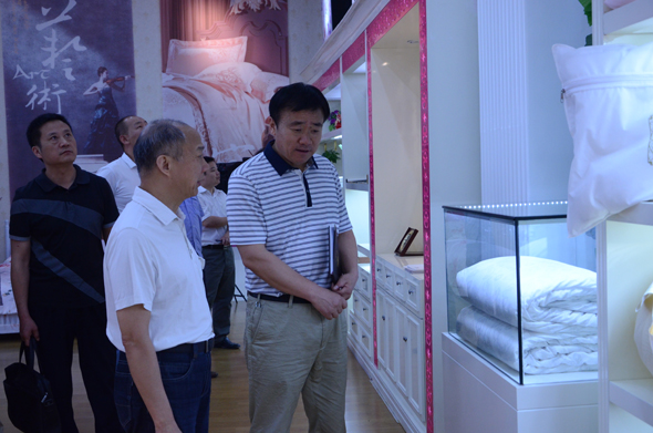 亓主任一行在馬董事長的陪同下,首先參觀了華詩雅蒂產(chǎn)品展示廳。代表著高端生活品質(zhì)且引領(lǐng)時(shí)尚潮流的華詩雅蒂真絲系列產(chǎn)品讓亓主任一行產(chǎn)生了濃厚的興趣,紛紛伸手觸摸、親身感受真絲產(chǎn)品帶來的絲爽順滑,并嘖嘖稱贊京九絲綢在馬品德董事長的帶領(lǐng)下取得的迅速發(fā)展。