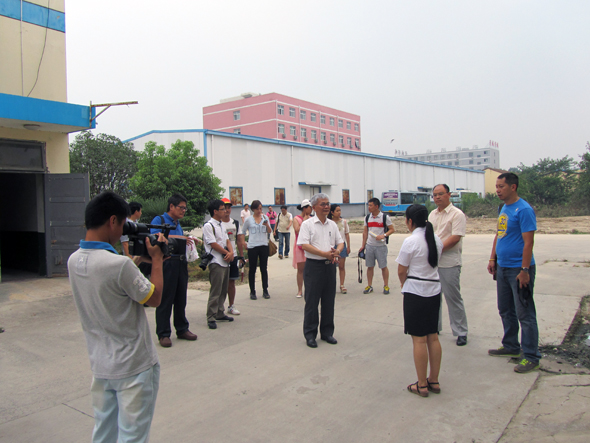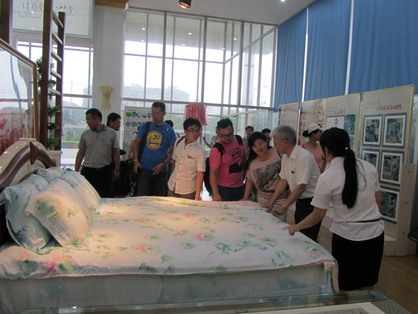 采訪團(tuán)一行首先深入車(chē)間一線現(xiàn)場(chǎng)察看了絲綢生產(chǎn)的流程與工藝,對(duì)整個(gè)絲綢的生產(chǎn)工藝與流程饒有興致、頻頻拿起手中的鏡頭不時(shí)攝下感興趣的生產(chǎn)畫(huà)面及現(xiàn)場(chǎng)感人的情景。當(dāng)采訪團(tuán)一行來(lái)到華詩(shī)雅蒂產(chǎn)品展示廳時(shí),面對(duì)絲綢的高科技工藝品及古老的絲綢厚重文化倍加贊賞、嘖嘖稱(chēng)奇,在絲綢魅力的巨大沖擊下,其中有幾個(gè)人情不自禁當(dāng)場(chǎng)買(mǎi)下了蠶絲被、夏涼毯、絲綢睡衣、蠶沙枕、還有價(jià)格不菲的絲綢版《論語(yǔ)》書(shū)藉。馬董事長(zhǎng)在產(chǎn)品展示廳與《旺報(bào)》社長(zhǎng)黃清龍親切交談中國(guó)絲綢的歷史文化及公司為傳播中國(guó)絲綢文化、振興民族傳統(tǒng)產(chǎn)業(yè)不遺余力的作為,深得社長(zhǎng)一行的欽佩與贊賞,黃社長(zhǎng)表示,在阜陽(yáng)為期七天的采訪中,將認(rèn)真采訪,把京九絲綢的絲綢特色與發(fā)展作為亮點(diǎn)之一,做好宣傳,努力架起阜陽(yáng)與臺(tái)灣之間的經(jīng)濟(jì)與文化交流合作的橋梁。