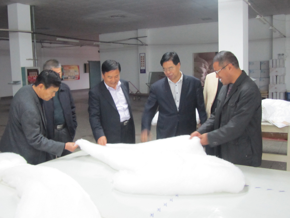 葛主席詳盡匯報了公司近年來不斷發(fā)展壯大的歷程與轉(zhuǎn)型發(fā)展情況。他說到,在市委、市政府的政策扶持下,公司依托本地蠶;氐膬(yōu)勢,一直致力于絲綢文化與品牌建設(shè),積極推動企業(yè)轉(zhuǎn)型發(fā)展的步伐。華詩雅蒂潘經(jīng)理就華詩雅蒂品牌的發(fā)展歷程、近年來獲得的一系列行業(yè)殊榮向范主席一行作了詳細(xì)介紹。在葛主席、潘經(jīng)理的陪同下,范主席一行冒著細(xì)密如織的秋雨,深入選繭、繅絲、復(fù)整、劍桿等生產(chǎn)車間查看了具體的生產(chǎn)工藝流程。在華詩雅蒂生產(chǎn)車間內(nèi),范主席、李部長紛紛駐足,饒有興趣的在拉制蠶絲被的臺案前看工作人員現(xiàn)場拉制手工蠶絲被,并忍不住伸出手來感受一番。