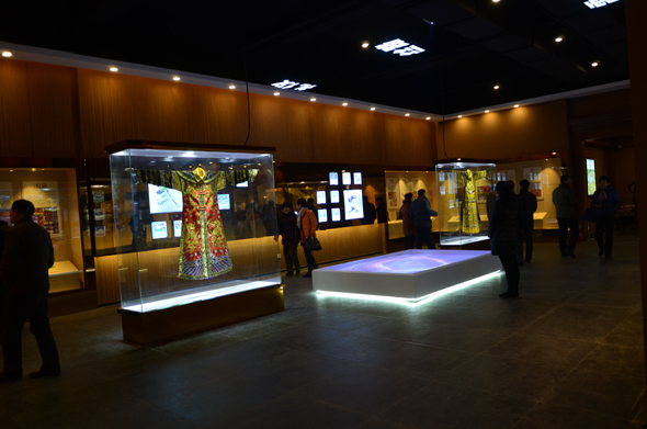 駐足博物館外,頗具藝術(shù)性的外形設(shè)計新穎獨特,將絲綢元素淋漓盡顯,令人遐想千絲萬縷的絲與綢其博大精深的歷史底蘊與厚重文化。踏入博物館,猶如步入了一個藝術(shù)長廊:嫘祖始蠶、張騫出使西域開通陸上絲綢之路、鄭和下西洋開通海上絲綢之路、黃母傳道和蠶桑絲帛的發(fā)展歷程,遠(yuǎn)古時期絲綢的厚重歷史,被展示在墻壁上一幅幅古樸精彩的連環(huán)畫中,每一幅圖畫都講述著不凡的故事。那三米高的大花樓織機格外醒目,由1924個部件組成,是國家級非物質(zhì)文化遺產(chǎn)。最吸引人眼球的是歷時四個多月一比一還原嘉慶時期的龍袍,尊貴與奢華盡顯王者風(fēng)范。在每一個展廳都有其獨特精彩的環(huán)節(jié),全館共陳列600余件文物、標(biāo)本、圖片、機具和現(xiàn)代展品,多角度、全方位展現(xiàn)了厚重的絲綢文化與其繽紛奢華的絲綢世界,頗具中國特色和現(xiàn)代創(chuàng)意,帶來無盡優(yōu)雅風(fēng)尚得到了來賓的高度評價和認(rèn)可。參觀者不僅能全面領(lǐng)略到中國絲綢文化的歷史與現(xiàn)實面貌,對絲綢的制作原料、加工工藝、印染技術(shù)等有全面而系統(tǒng)的認(rèn)識,同時也是京九絲綢18年厚積薄發(fā)禮獻(xiàn)阜城市民,引領(lǐng)絲綢發(fā)展的新力量。