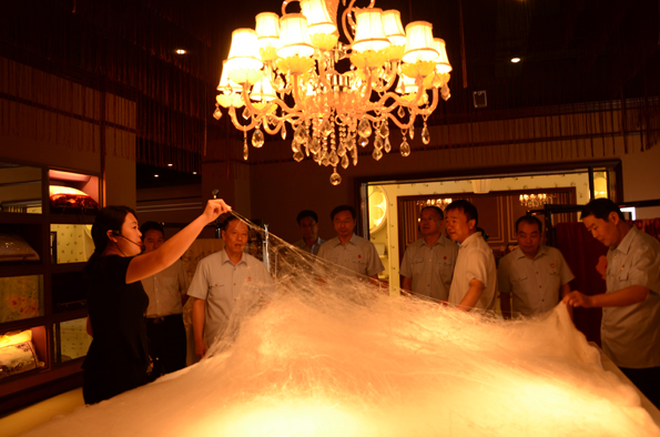 馬董事長(zhǎng)在介紹時(shí)說(shuō)道:“從栽桑養(yǎng)蠶到繅絲再到織造最后到絲綢成品,公司已形成了一條內(nèi)涵豐富、實(shí)力雄厚的完整產(chǎn)業(yè)鏈。每個(gè)環(huán)節(jié)中注重創(chuàng)新發(fā)展,比如在養(yǎng)蠶的環(huán)節(jié)中其溫度、濕度的控制,繅絲中煮繭的技術(shù),華詩(shī)雅蒂新產(chǎn)品的開(kāi)發(fā)等等,都體現(xiàn)了很高的工藝水平!痹谡麄(gè)參觀過(guò)程中,張?jiān)洪L(zhǎng)一行表現(xiàn)出了濃厚的興趣,每到一個(gè)生產(chǎn)車間都仔細(xì)觀察其相關(guān)的生產(chǎn)工藝與產(chǎn)品。