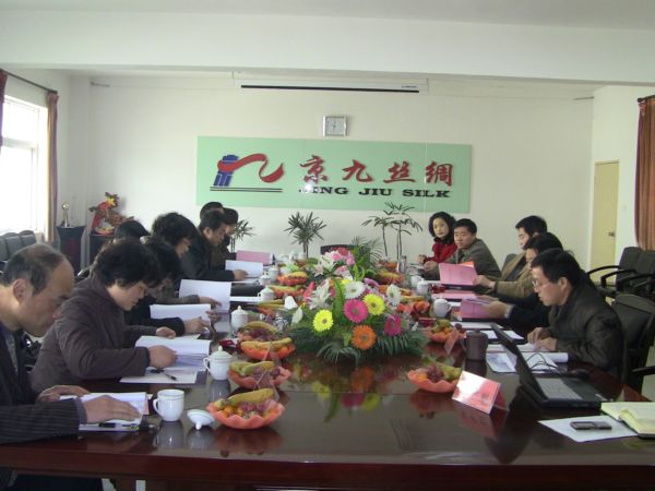 接著評審團(tuán)全體人員來到公司會議室。首先由公司常務(wù)副總李開典向各位匯報我公司與安徽農(nóng)業(yè)大學(xué)共同合作完成的“真絲抗皺性能研究與應(yīng)用”項(xiàng)目的情況。李總說:真絲綢具有良好的手感、懸垂性、光澤和特殊的絲鳴感,吸濕透氣、柔軟滑爽,穿著舒適,而且具有一定的保健性,是一種十分優(yōu)雅華貴的面料,但其易起皺,抗皺性差的缺點(diǎn),很大程度上影響了它的實(shí)用價值。所以,解決真絲綢織物的抗皺性問題一直被國內(nèi)外研究人員所重視,因此研發(fā)具有良好抗皺性的真絲面料對中國乃至世界絲綢發(fā)展都具有重要意義。公司早在2007年10月份就與安徽農(nóng)業(yè)大學(xué)輕工學(xué)院協(xié)商,決定共同合作進(jìn)行“真絲抗皺性能研究與應(yīng)用”,該項(xiàng)目被安徽省科技廳批準(zhǔn)為“安徽省二00八年科技攻關(guān)計(jì)劃重大科技專項(xiàng)” 項(xiàng)目。項(xiàng)目組歷時兩年多的時間,通過抗皺技術(shù)的集成應(yīng)用,采用獨(dú)特的線型設(shè)計(jì)、添加非真絲類纖維混合紡織的線型結(jié)構(gòu)、織物組織變化等方式增加真絲綢的彈性恢復(fù)率和抗皺性,并通過電離輻射接枝反應(yīng)后整理技術(shù),使真絲織物抗皺回復(fù)角基本達(dá)到了330度。項(xiàng)目開發(fā)了格子電力紡、彈力緞、斜喬縐、新型斜紋綢等具有抗皺性能的四只新產(chǎn)品,經(jīng)江蘇省紡織產(chǎn)品質(zhì)量監(jiān)督檢驗(yàn)研究院根據(jù)GB/T3819-1977《紡織品 織物折痕回復(fù)性的測定 回復(fù)角法》檢測,達(dá)到任務(wù)書規(guī)定的技術(shù)指標(biāo)。項(xiàng)目達(dá)產(chǎn)后將取得較好的經(jīng)濟(jì)效益和社會效益。